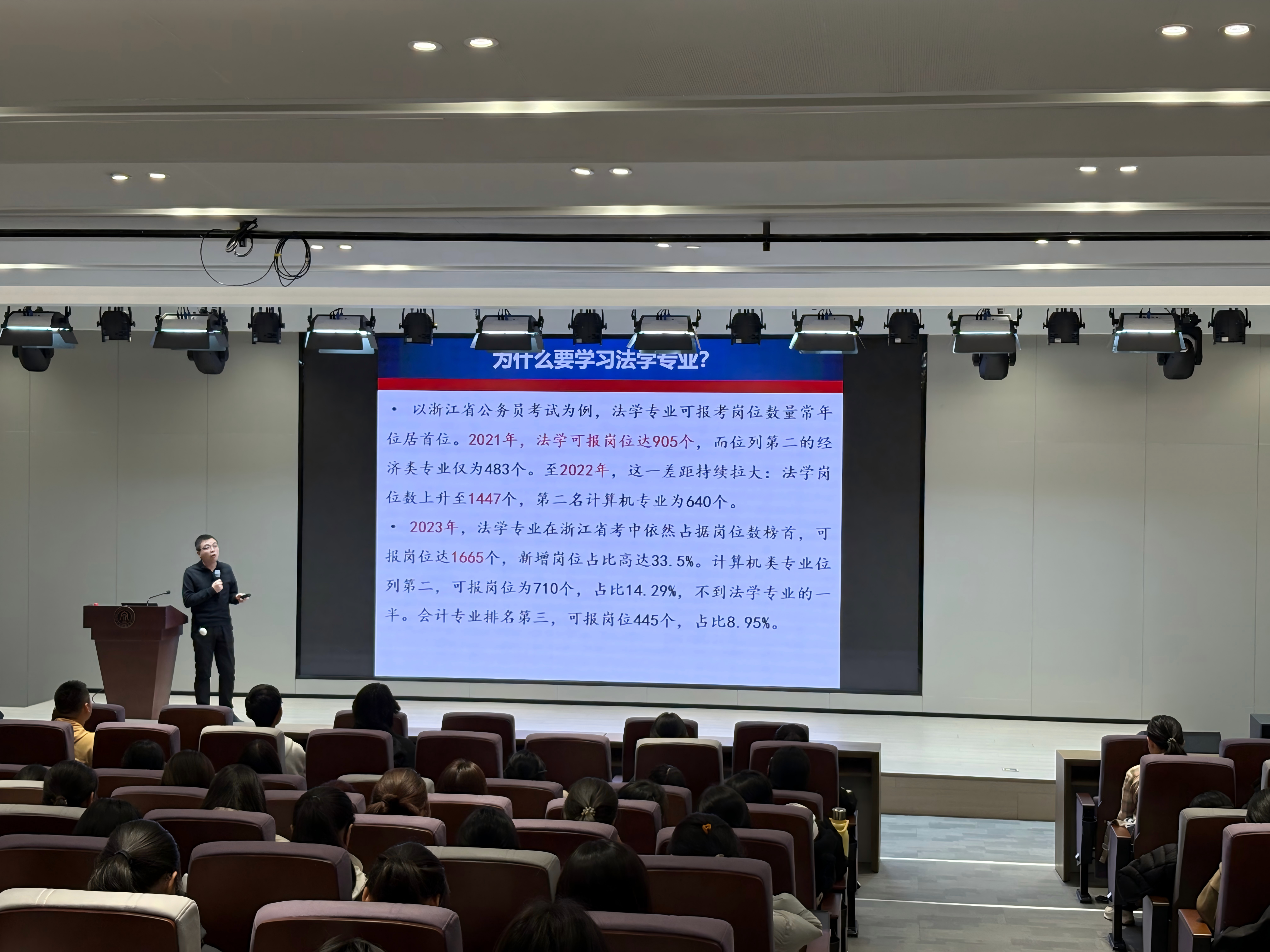 钱炜江老师指出,法学专业具有显著的系统优势,集中体现在其高度的专业壁垒与持续的就业张力。在专业能力培养上,法学院教学成果扎实,近年来学生司法考试通过率持续亮眼,为学生进入法律职业领域奠定了坚实基础。在就业层面,以浙江省公务员招录为例,法学类专业可报考岗位数量逐年攀升,此外,法院、检察院系统亦持续扩大招录规模,法学人才在公共部门的需求日益增强,共同构筑起法学专业多元而稳健的职业发展通道。