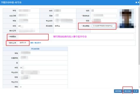 注意:“申请理由”必须填写自已意向转入的哪个院内专业(类),附件模板见附件1,具体操作如下: