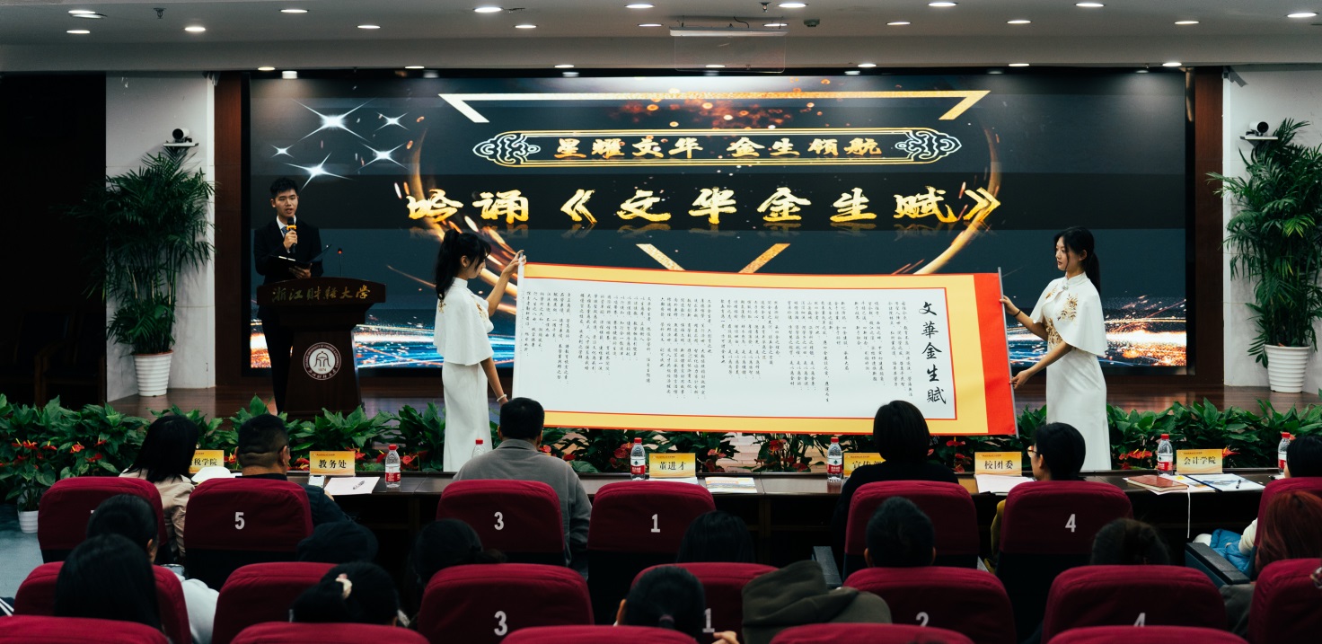 活动现场由文华学子代表吟诵学院师生联创作品《文华金生赋》,诗作从浙财办学历史开篇,应“四新”建设要求,承“四金”理念,开金生先河,系统凝练了文华学院办学特色和“金生”内涵,全面展示文华学子和社会对新财经人才培养的愿景和期待!