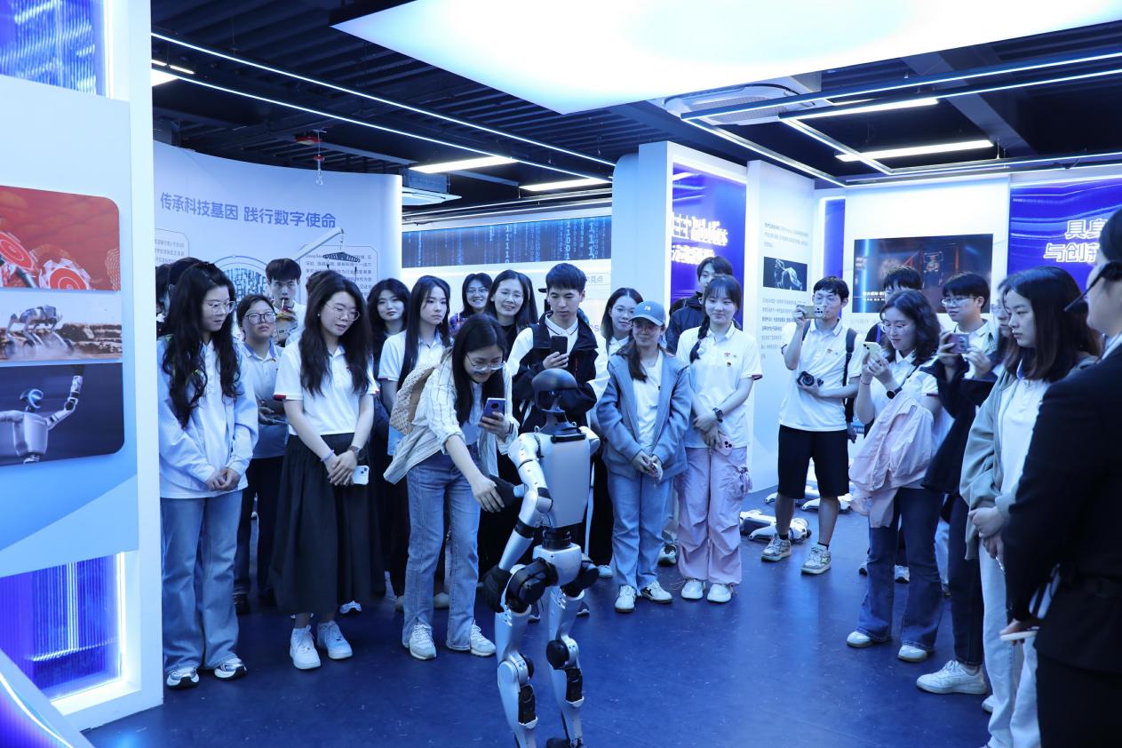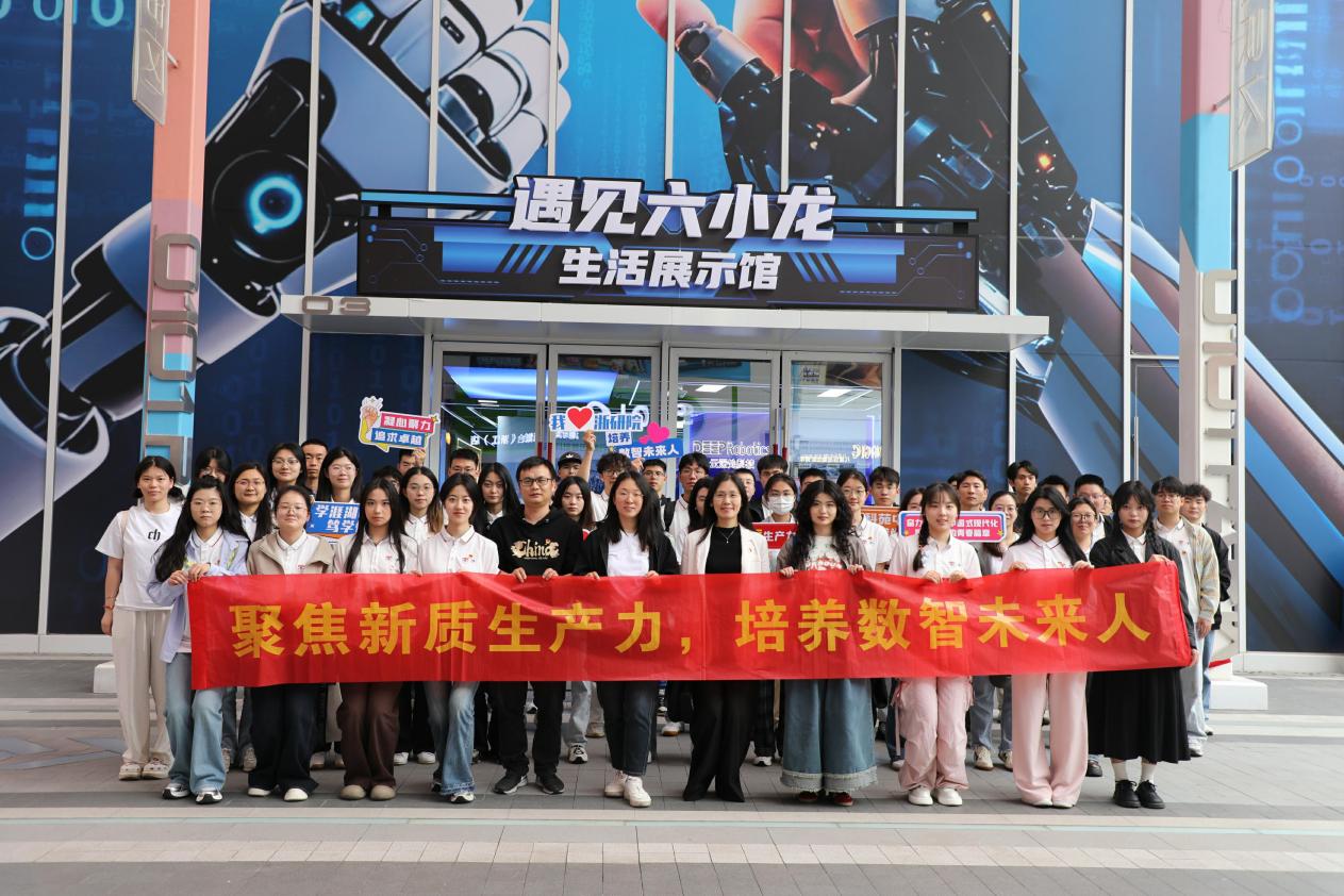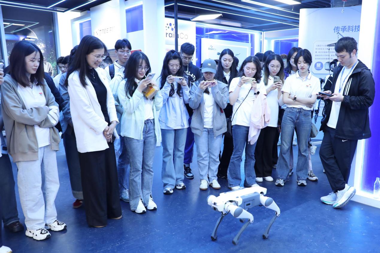 在杭州六小龙生活展示馆,师生党员们近距离体验了前沿科技与数字生活的深度融合。云深处科技的机器狗以矫健身姿表演后空翻,其灵活的律动和拟人化的互动引得阵阵赞叹;深度求索(DeepSeek)展区的汤姆猫AI情感陪伴机器人以俏皮的语言与讲解员流畅对话,展现了人工智能的情感化应用;全球瞩目的游戏科学团队带来的国产3A大作《黑神话·悟空》试玩区,更是让同学们化身“齐天大圣”,亲身体验国产游戏的技术突破与文化魅力;宇树科技的人形机器人主动与师生握手互动,生动诠释了“人机协同”的未来图景;在VR眼镜体验区,师生党员们纷纷佩戴设备,透过小小镜片探索巨幕空间的震撼视效,切身感受虚拟现实技术的无限可能。