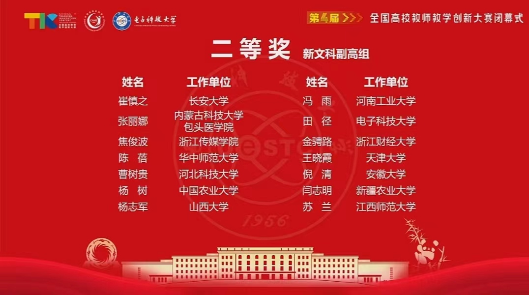 7月31日,由教育部高等教育司指导、中国高等教育学会主办的第四届全国高校教师教学创新大赛全国现场赛在成都落下帷幕。经过激烈角逐,我院导师金骋路副教授获新文科副高组二等奖。这是我校教师连续三年在此项全国赛事中获奖。